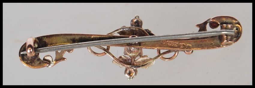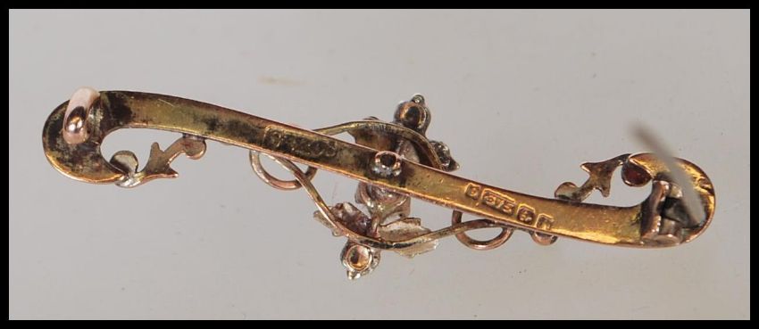 A hallmarked 9ct gold early 20th Century Edwardian bar brooch of scrolled form set with seven seed pearls in a foliate setting. Hallmarked Birmingham (date letter rubbed). Measures 4.5cm wide. Weight 2.1g.