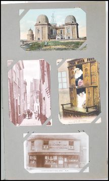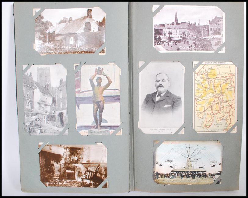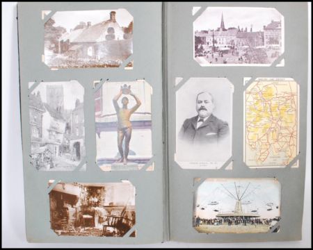 Postcard collection (304) in Edwardian Art Nouveau style album. Diverse range of antique / vintage cards noted: Shopfronts, Oldham RFC, Rail Station, Public House, street scenes with interesting assortment of subjects. Most pre WWII / Second World War. An impressive selection of items.