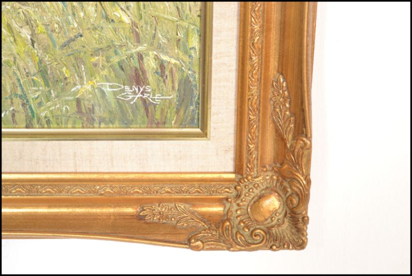An oil on canvas painting by Dorset artist Denys Garle depicting Swans from the river bank believed to be Christchurch, Dorset. Signed to corner and set within an ornate gilt frame. 60cms x 75cms.
