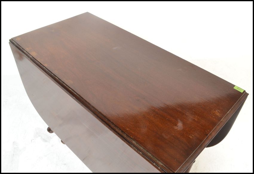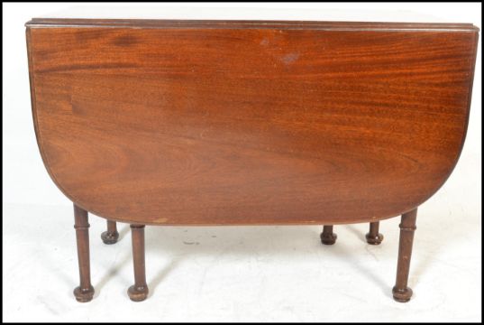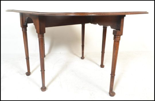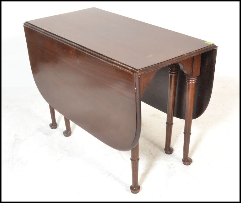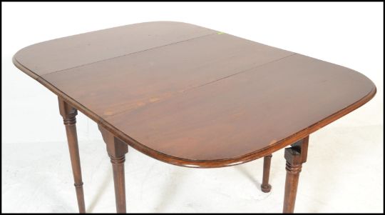 A 19th Century George III mahogany drop leaf dining table, gate leg action supports,raised on shaped ring turned legs uprights terminating on pad feet. Measures 75cm high x 106cm wide x 55cm depth.