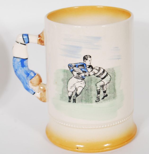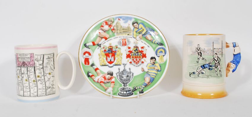 A mid 20th Century Arthur Wood Royal Bardwell ceramic tankard depicting Rugby players with the handle in the shape of a Rugby player. Together with a Wedgwood plate for the Rugby League cup final 1990, having a list of players, referees and touch judges to verso and a London to Bristol map mug by Wedgwood.