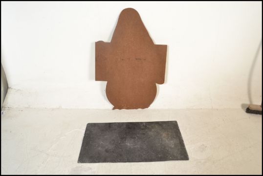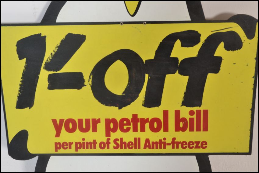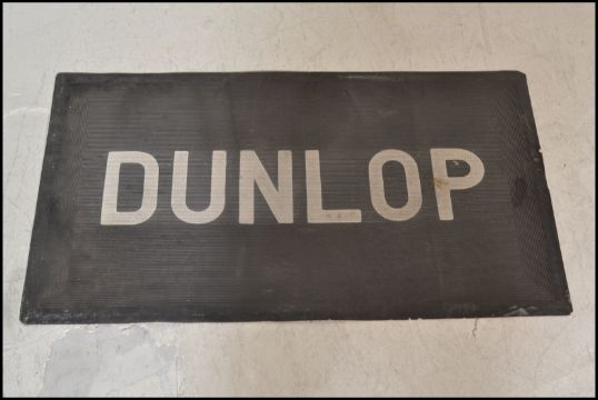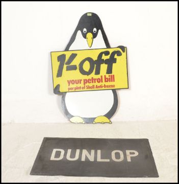 A vintage 20th century Shell advertising board in the form of a penguin with notation to centre. The wooden board with painted front. Together with a vintage Dunlop petrol station floor mat. 107cms x 74cms