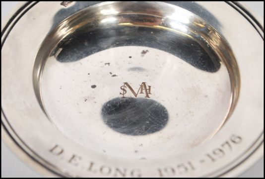A silver hallmarked pin dish, engraved to the centre with the initials SMH, inscription to the edge of the dish reading D.E. Long 1951-1976, assay mark for London, makers marks for John Henry Odell and date letter for 1976. Weighs 84g