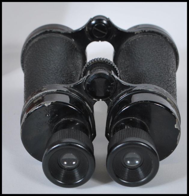 A pair of 20th Century Barr & Stroud 7x 50 binoculars no. CF15 having a central focusing dial and brown leather case.