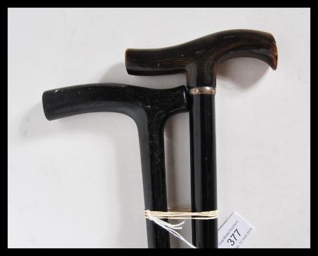 A pair of 20th Century crook handle walking sticks / canes, having tapering ebony shafts, one having a silver coloured collar and the other with a brass ferrule.