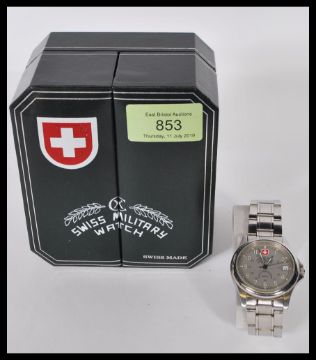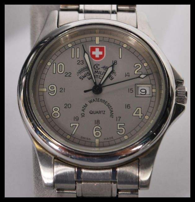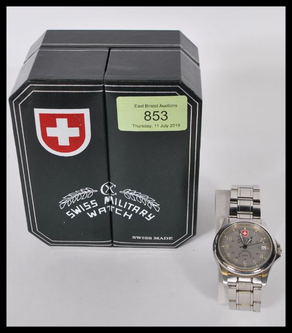 A cased Swiss Military wristwatch by Charmex of Switzerland. The watch set to a stainless steel bracelet complete with the paperwork and leather 2 door case