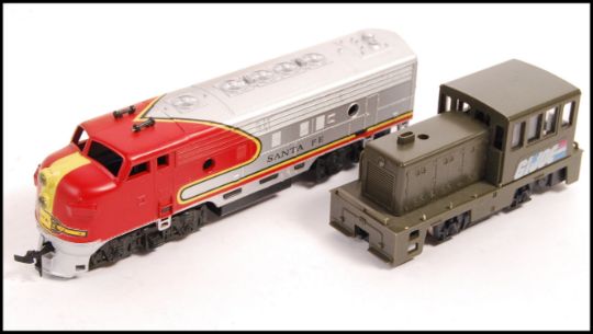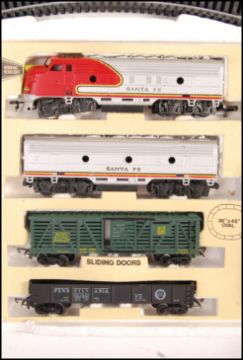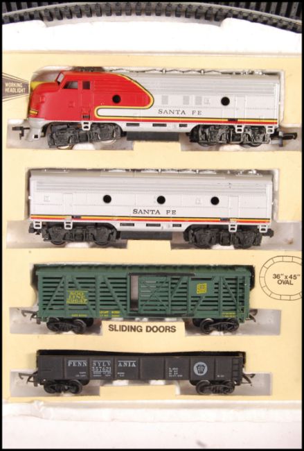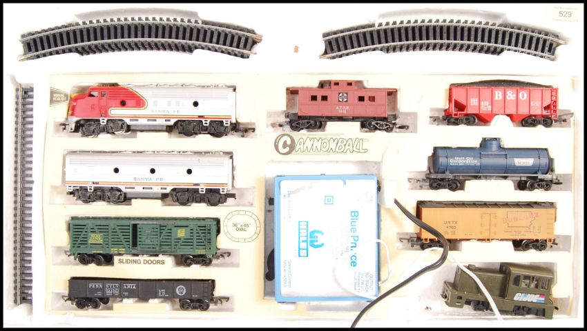 An original vintage believed Bachmann made HO / 00 Gauge model railway train set Cannonball Express Santa Fe having track and rolling stock. Locomotive present but no dummy. Along with a Made In Yugoslavia RSO model train locomotive.