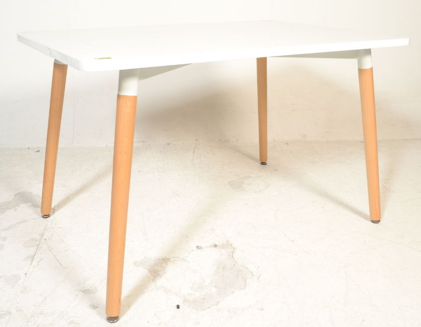 A contemporary white laminated and ash dining table. The table comprising of a laminated wooden table top with metal brace and round tapering ash wood legs. Measures 74 cm high, 130 cm wide and 80 cm deep, ptogether with a set set of six contemporary dining chairs comprising injection moulded green plastic shell seats raised on a metal fixing and tapering beech legs. In the manner of Charles & Ray Eames. Measures; 81cm x 46cm x 46cm.