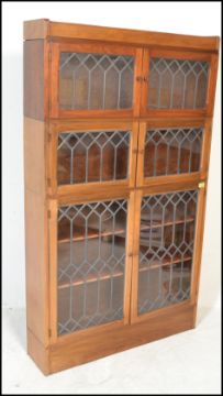 A 20th Century mahogany three sectional lawyers bookcase in the manner of Globe Wernicke. The mahogany top with its raised ends and shaped frieze over three double doors, each with a turned knob and leaded glass panels, raised on a plinth base. Measures 156cm high x 92cm wide x 22cm depth.