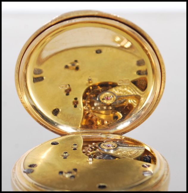 A 18ct gold hallmarked open face pocket watch W. Ehrhardt of Hockley, No.190224, having a white enamelled face with roman numerals to the chapter ring and subsidiary dial to six, engraved monogram to the back. Hallmarked for Birmingham date letter U, makers mark WE William Ehrhardt. Gross weight 96.1g.