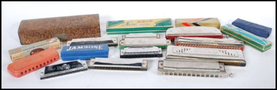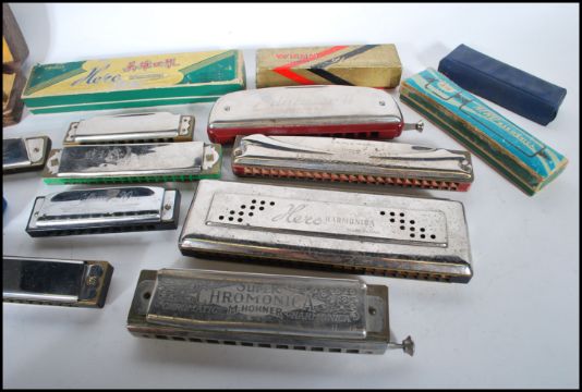 A collection of vintage 20th Century harmonica's to include a cased M Hohner 64 Chromonica, M Hohner Educator II, Hero harmonica's, Harding Melodia, Wren Tremolo etc. Some still in their original boxes.
