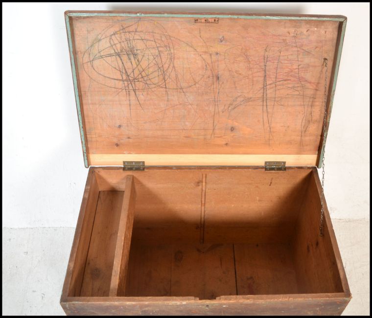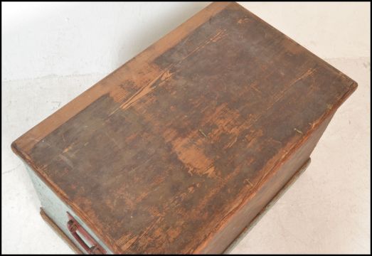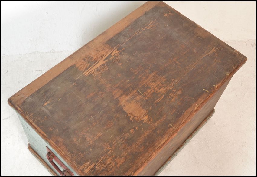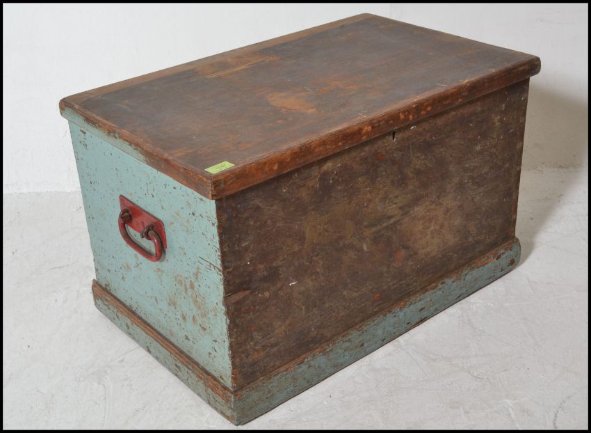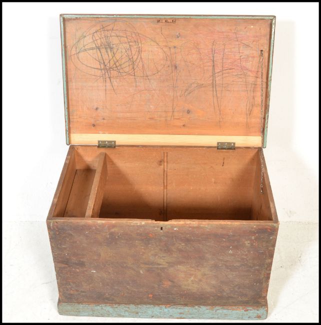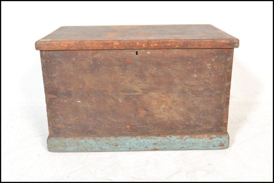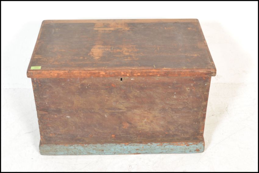 A 19th Century Victorian pine blanket box / chest, hinged scrubbed top opening to reveal candle box over painted sides raised on a plinth base. Measures 46cms H x 73cms W x 46cms D.