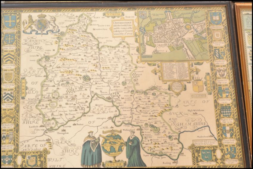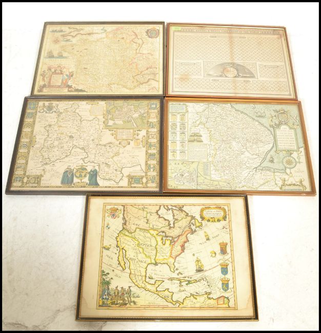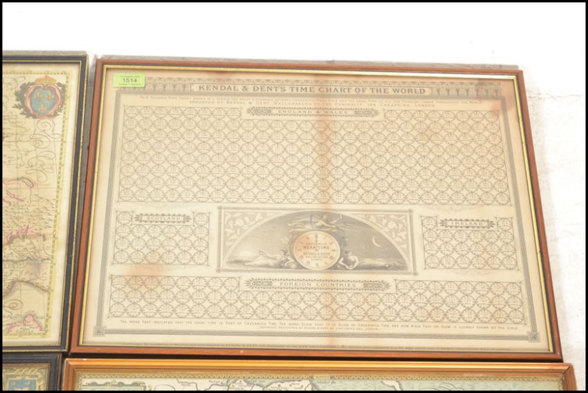 A collection of vintage reproduction antique maps to include Kendall & Dent's Time Chart of the World, a map of Warwicksire, map of Yorkshire, map of the Americas, and a map of Europe. All framed and glazed. Largest is 42cms x 55cms