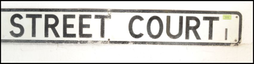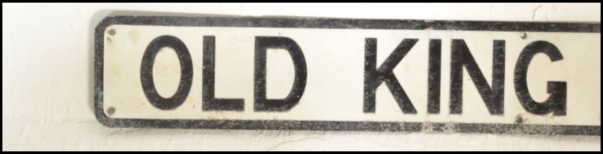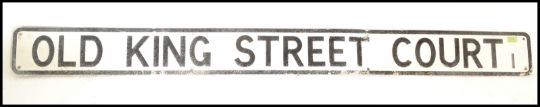 An original 20th century Industrial metal street sign for Old King Street Court (Bristol) having black lettering and border on white ground. Measures 15cm x 173cm.