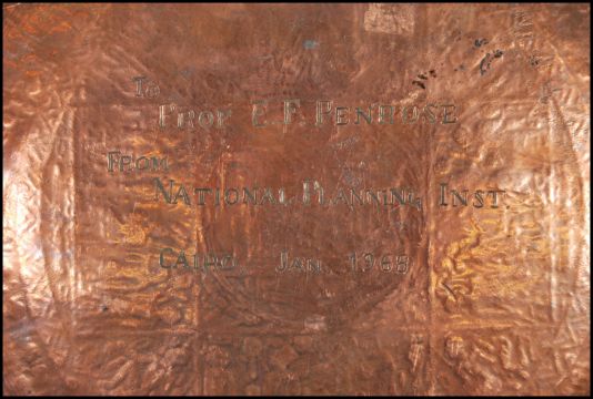 A 20th Century presentation copper wall charger, having silver inlay with various ancient Egyptian figural scenes and geometric pattern inlaid border. Inscription to verso ' To prof E.F. Penrose from National planning inst Cairo, Jan 1968. E.F Penrose was an author who wrote mostly about International relation and Economics. Test as silver.
