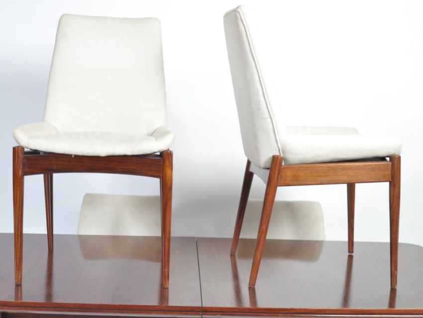 Robert Heritage - Archie Shine - Hamilton - A 1950's retro vintage rosewood dining suite consisting of a large extending dining table with leaf raised on tapering legs with angled stretchers along with a set of six rosewood dining chairs with floating cushioned seat and backrest raised on round tapering legs. CITES certificate no. 576934/01. Measures; 72cm x 183cm x 87cm.
