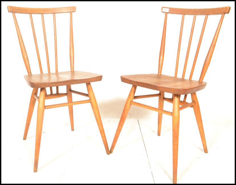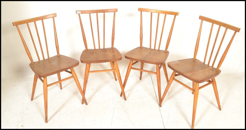 A set of four vintage retro 20th century Ercol beech and elm Windsor model 391 dining chairs having stick backs with shaped back rests. Raised on spindle legs with panel seats. Measures:  80cm high x 39cm wide x 35cm deep.