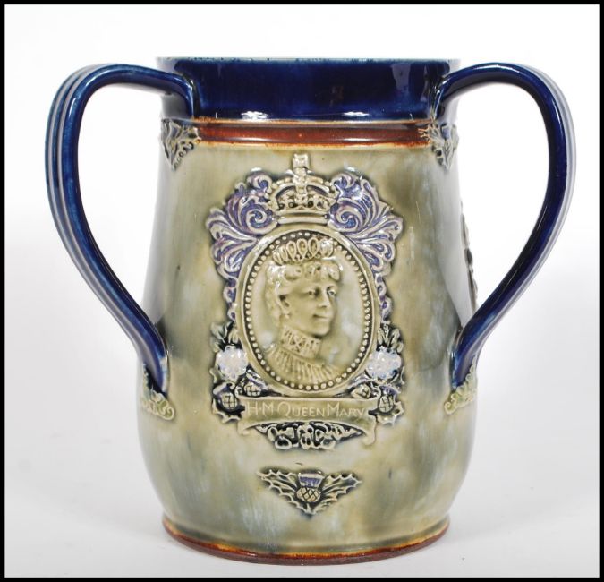An early 20th century Royal Doulton three handled large loving cup commemorating '  The Coronation of King George V and Queen Mary 1911 ' Impressed stamps to the base. Measures 16.5cms high