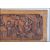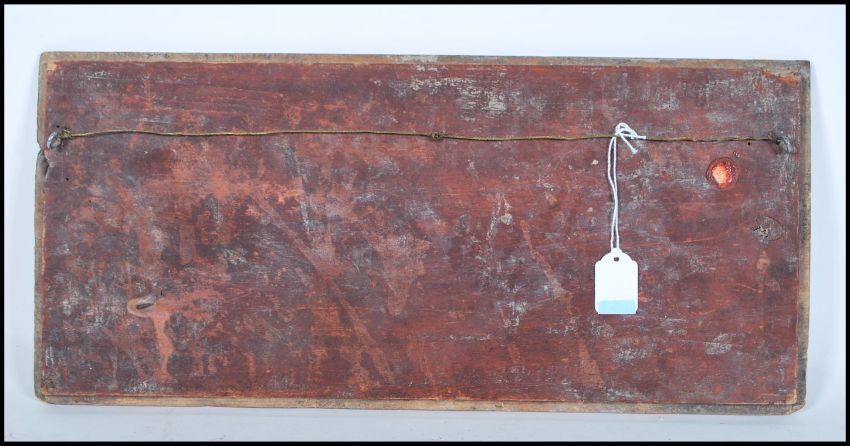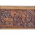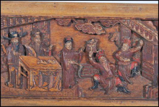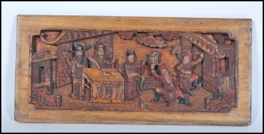 A 19th Century Chinese hand carved wall hanging panel depicting a courtyard scene with red detailing. Remnants of a wax seal to verso. Measures 21cm tall by 45cm wide.