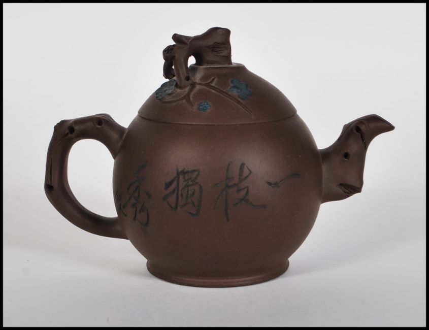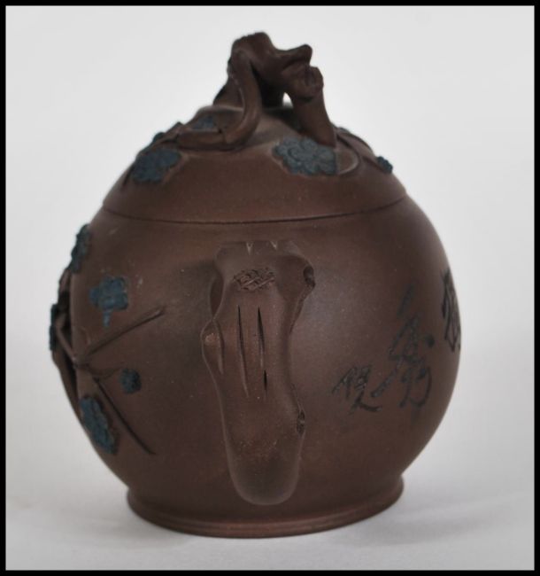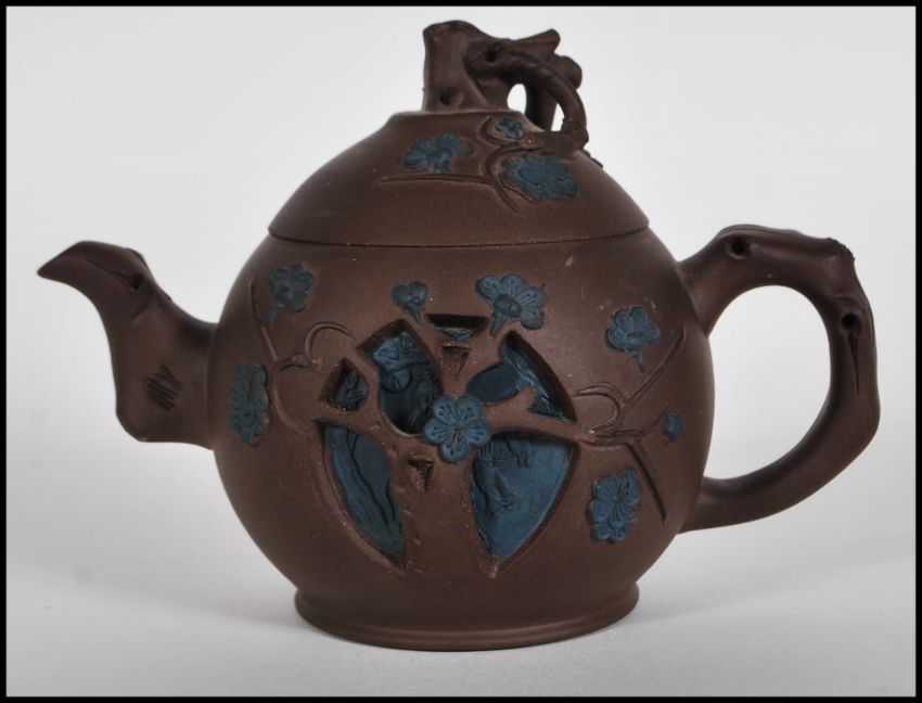 A 20th Century Chinese Yixing brown clay teapot having handle and spout modelled as a tree trunk with relief flower heads and pierced decorated tree with drop black background to body. Marks to base and under side of cover. Measures 12cm tall by 17cm wide.
