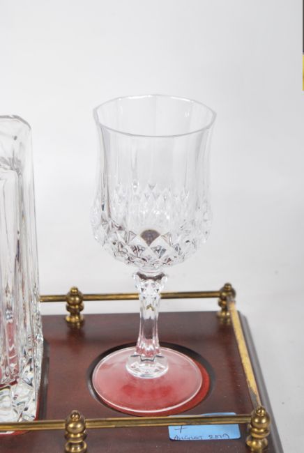 A 20th Century cut glass crystal decanter and glass tantalus set, the set to include decanter with stopper and a pair of matching glasses set to a mahogany plinth base with brass gallery surround.