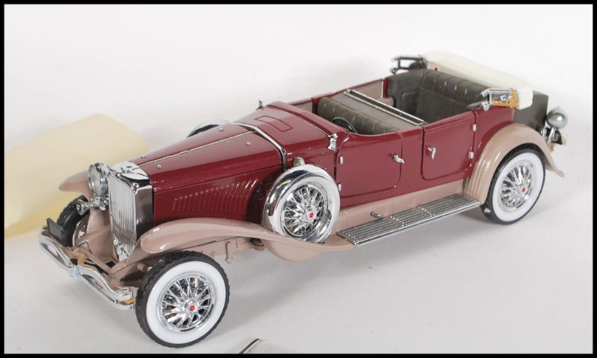 A collection of five Franklin Mint 1:24 scale precision model cars to include 1929 Bentley, 1993 Rolls- Royce Corniche IV, 1938 Alvis 4.3 Litre, 1930 Duesenberg Derham Tourster and 1955 Bentley. All being in original polstarien. Most appear complete with slight damage.