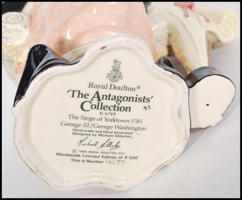 A collection of three Royal Doulton character ceramics to include The Antagonist Collection D6749 The Siege Of Yorktown 1781 George III /George Washington 4677/9500, character jug of the year 2006 Queen Elizabeth II D7256 and a Royal Doulton International Collectors Club Old Salt teapot D6818.