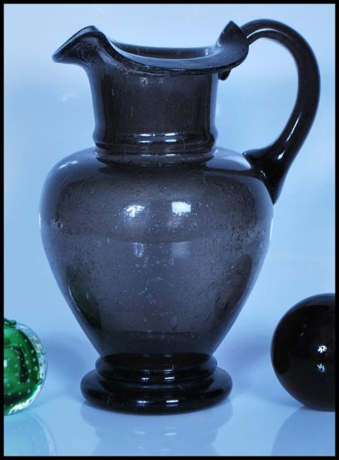A 20th century hand made French BIOT soda glass jug , having circular base, shaped handle and control bubble glass body finished in dark purple colour together with a good collection of nine mid 20th century paperweights to include various designs and colour. Measures: 26cm tall.