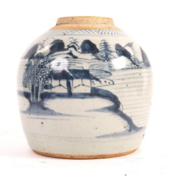 An antique 19th Century Chinese oriental blue and white ginger jar having hand painted classical Chinese landscape scenes and fisherman, with an unglazed neck.  Measures: 16cm tall.