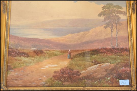 Maud Fisher ( British 20th century ) Watercolour painting entitled ' Lower Peter Street, As It Were ' Bristol. Signed by the artist with notation verso. Framed and glazed. Measures 38cms x 27cms. Together with another watercolour painting of a Cornish coastal scene with woman on pathway.