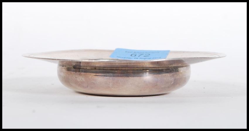 A silver hallmarked ashtray of round form with a flared rim. Hallmarked London (date mark rubbed). Weight 107.8g. Measures 12cm diameter.