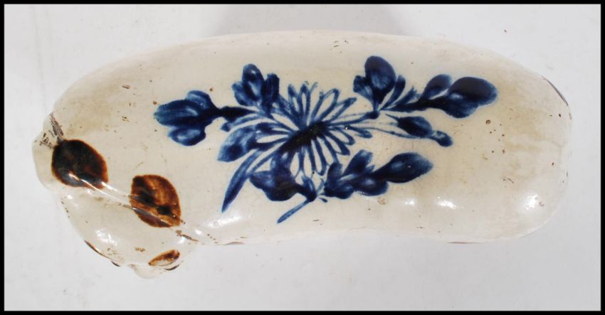 A 19th Century Chinese porcelain headrest pillow in the form of a cat brown decoration with blue and white floral spray to top. Measures 24cm long.