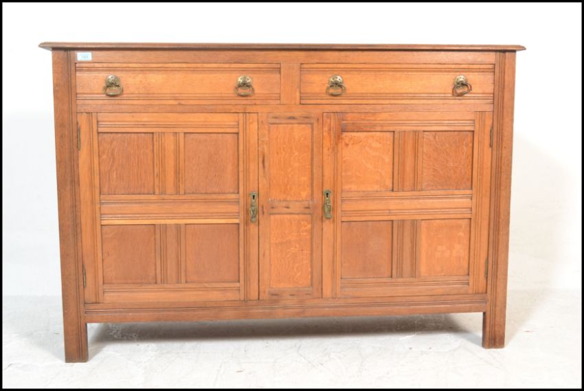 An early 20th Century oak sideboard buffet with quarter panel twin cupboard doors having two drawers above with brass swing handles to the doors and ring handles to the drawers. All raised on block legs. Measures: 92cm high x 137cm wide x 49cm depth.