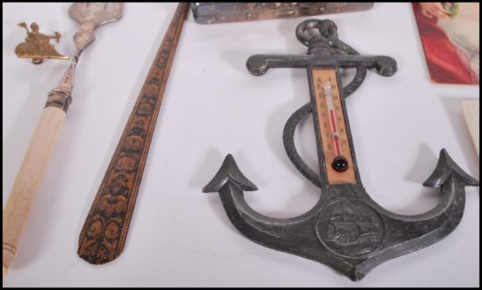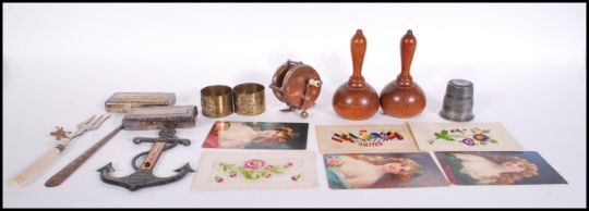 A small group of collectibles to include a Vintage American metal portage Atlas fishing Reel having a copper finish, two plated razor cases, a drinking measure in the form of a thimble, small Britannia badge, trench art napkin rings, sorrento / tunbridge ware page turner etc.