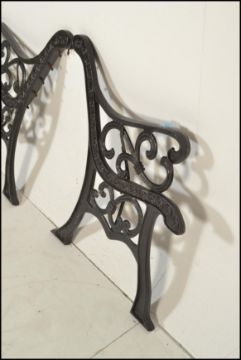 A pair of 20th Century cast iron scroll work garden bench ends together with a pair of metal scroll work wall hanging pot holder / trays. Measures: 80cm high x 50cm wide.