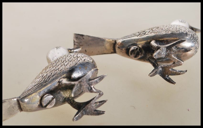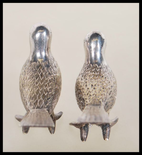 A pair of silver white metal salt and pepper condiments in the form of birds having engraved detailing and screw opening underneath. Tallest measures 5cm .