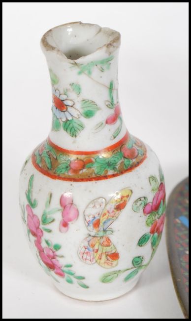 A pair of 18th / 19th Century miniature Chinese ceramic vases decorated with birds and fauna together with a Japanese enamel on copper pin dish having a central panel decorated with a warrior.Measures: 9cm tall.
