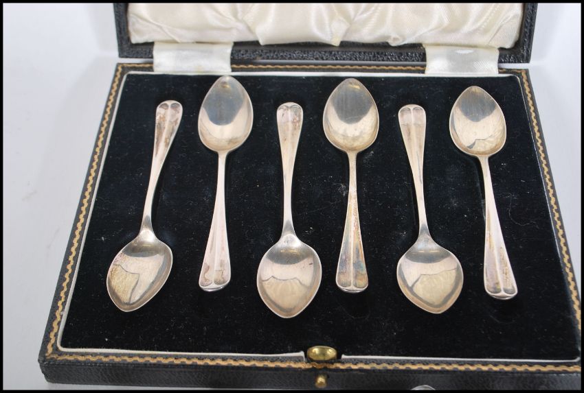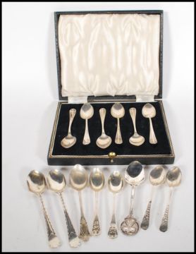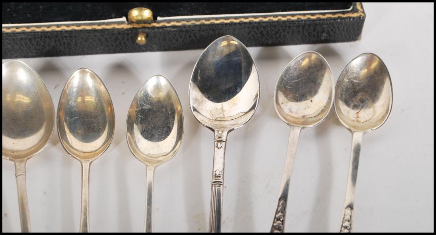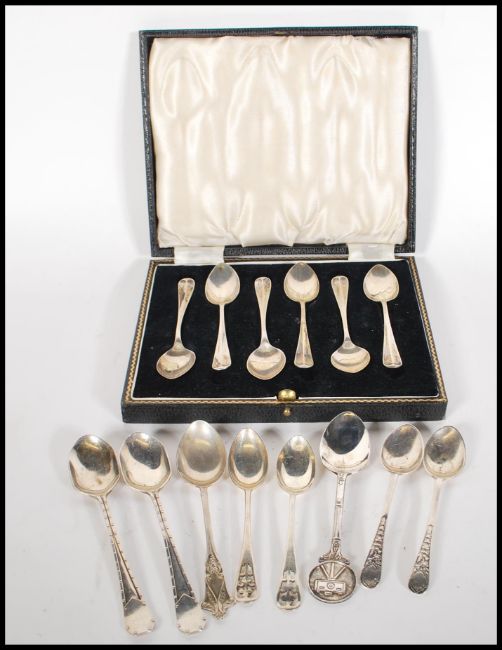 A cased set of early 20th Century silver hallmarked teaspoons, hallmarked for Sheffield date letter r, makers mark for Viner's Ltd (Emile Viner). Together with other silver hallmarked flat wear to include two teaspoons with beaded borders, hallmarked for sheffield date letter m 1904, Makers mark for Lee & Wigfull (Henry Wigfull), trophy teaspoon having camera decoration, hallmarked for Birmingham. Five other silver hallmarked spoons two being matching pairs. Approx weight of all silver spoons 150g.
