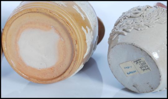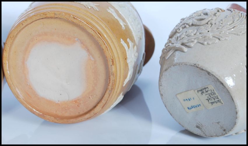 A collection of Doulton Lambeth stoneware to include City of London coat of arms jug, C1860, A lidded Doulton stoneware tobacco jar 2890 impressed marks, Doulton Lambeth Treadwin Dobbs 20 Milson Street Bath twin handled jug, Doulton Lambeth Honi Soit Qui Mal Y Pense inscribed jug.
