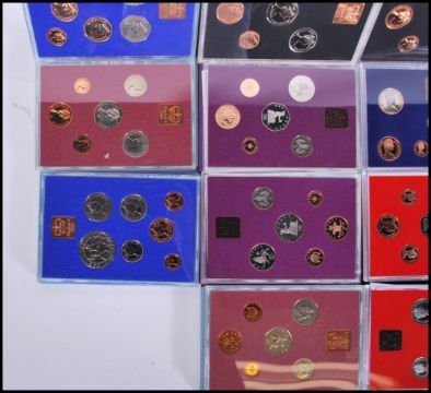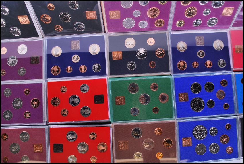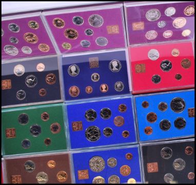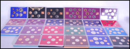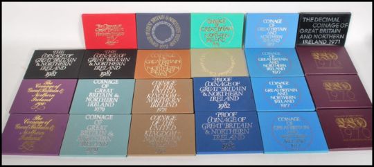 A collection of Royal Mint Coinage of Great Britain and Ireland commemorative annual coin sets to include 1970 x3, 1971, 1972, 1973, 1974, 1975,1976, 1977 x 4, 1978 x 2, 1979 x2, 1980 x 2, 1981 x 2 and 1982 x2, 23 in total.