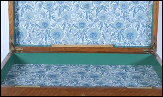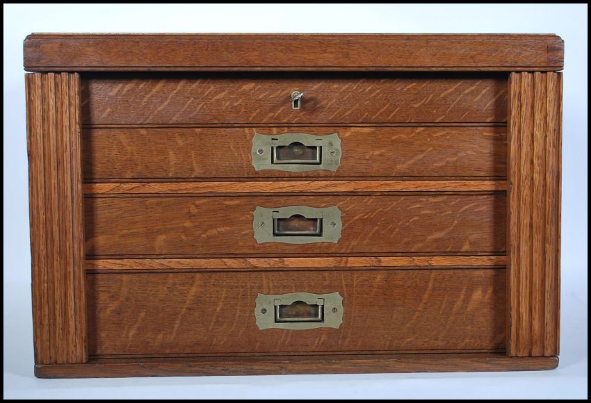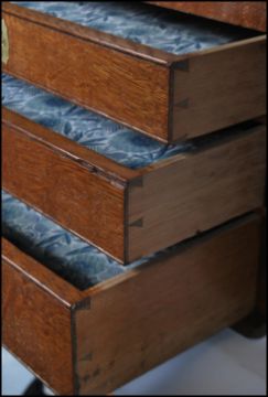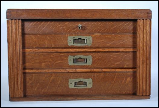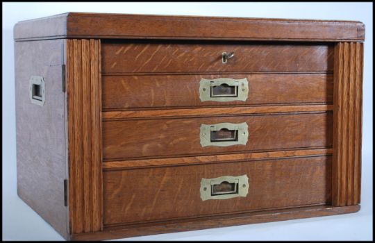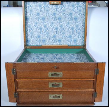 An early 20th Century campaign upcycled oak cutlery canteen, lift up lid Wellington chest front doors with three fitted drawers, recessed brass carry handles to the side. Ivorine makers plaque for Silver …………...