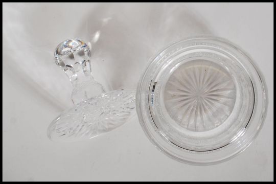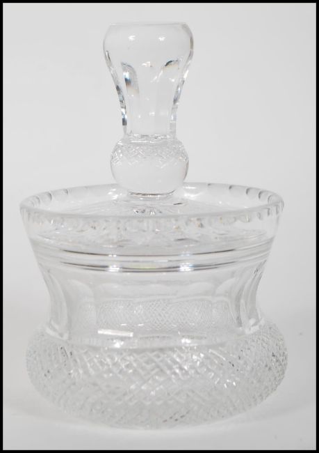 A 20th century Edinburgh crystal cut glass lidded pot in the form of a thistle, with faceted cut thistle shaped handle atop. Marked made in Edinburgh Scotland. Measures 13cm tall by 9cm diameter.