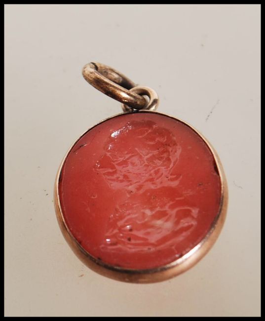 An early / mid 19th Century seal pendant having a red stone oval seal carved with a seated maiden with an urn and a cameo of a gentleman to the verso together with a silver fob seal with a red stone cabochon carved with a gentleman's cameo.