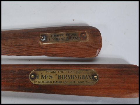 A group of five ashtrays of various forms being made from the teak of multiple boats, each one having small plaque to front to include H.M.S Spartiate, H.M.S Restless, H.M.S Victory, H.M.S Cambrian and barrel shape from H.M.S Victory. Together with two tapering pieces one form H.M.S Birmingham and S.S Great Britain.