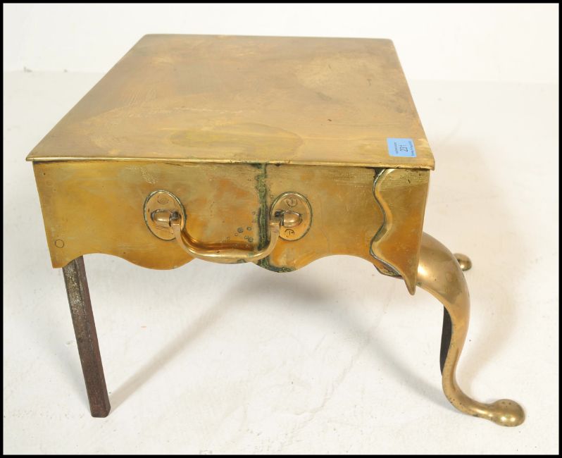 An early 20th Century brass footmans trivet / carriage step having bowed front legs with pierced decoration to the front and swing handles to either side.