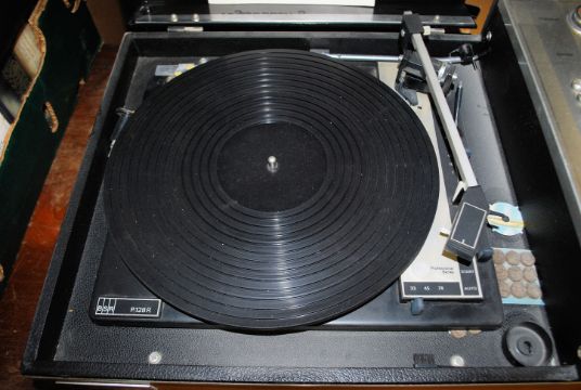A retro 20th Century teak wood cased Pye Black Box record player stereo, teak body with black perspex lift up lid fitted with a three speed BSR record deck together with a pair of matching teak cased speakers.