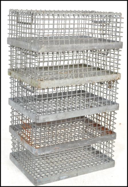 A stack of five mid century Industrial oyster / fish catchers crates. Each of metal form with grid mesh rectangular bodies with banded metal lower borders. Each measures 15cm x 47cm x 30cm