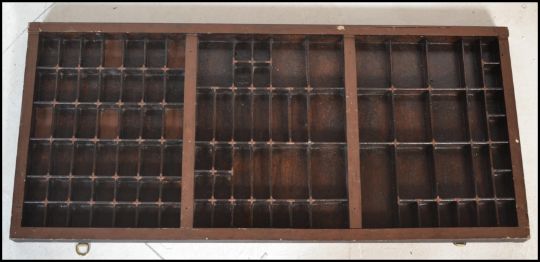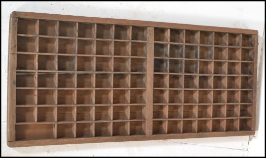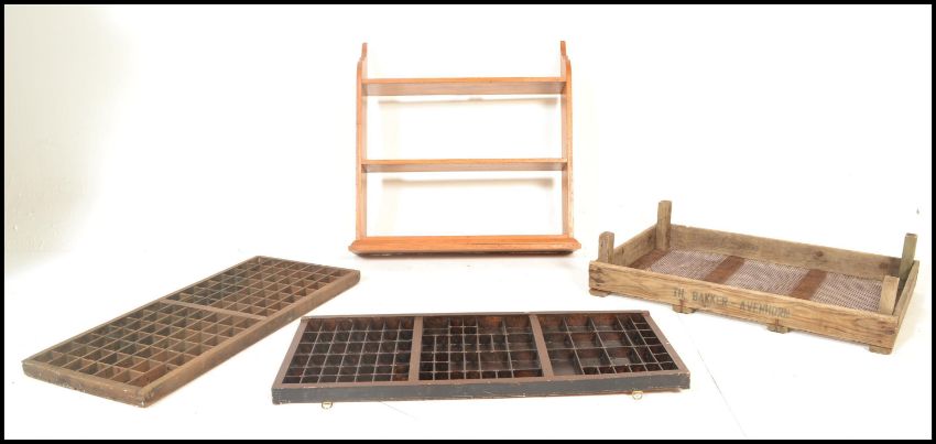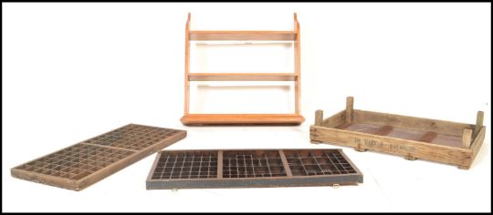 A collection of vintage 19th and 20th century storage items to include Industrial printers drawers having sectional interiors together with an industrial butchers tray of wooden construction with mesh to the top along with a a set of wooden wall hanging shelves. Shelves measure 80H x 65W x 18D.