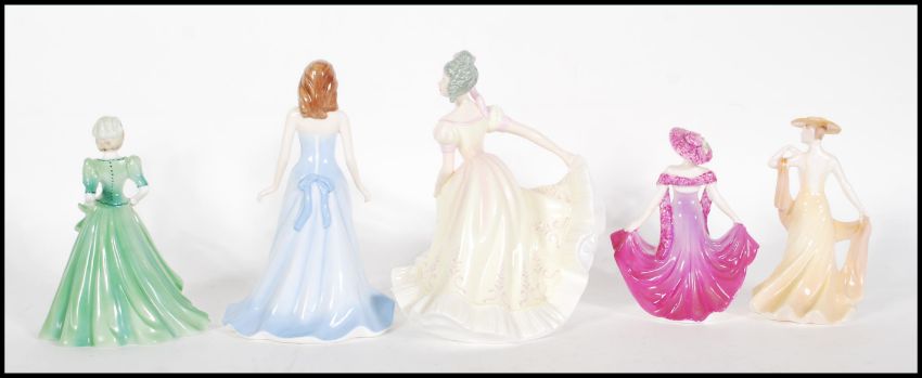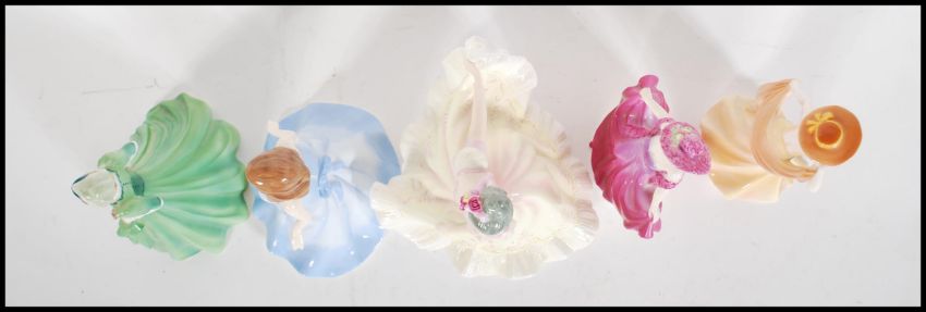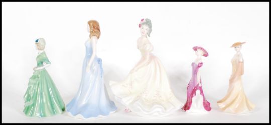 A group of five ceramic figurines to include Royal Doulton Pretty Ladies Lynette, Doulton Gemstones collection aquamarine, Coalport April, Coalport Debutante Stella and Coalport Carrie.
