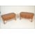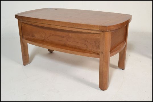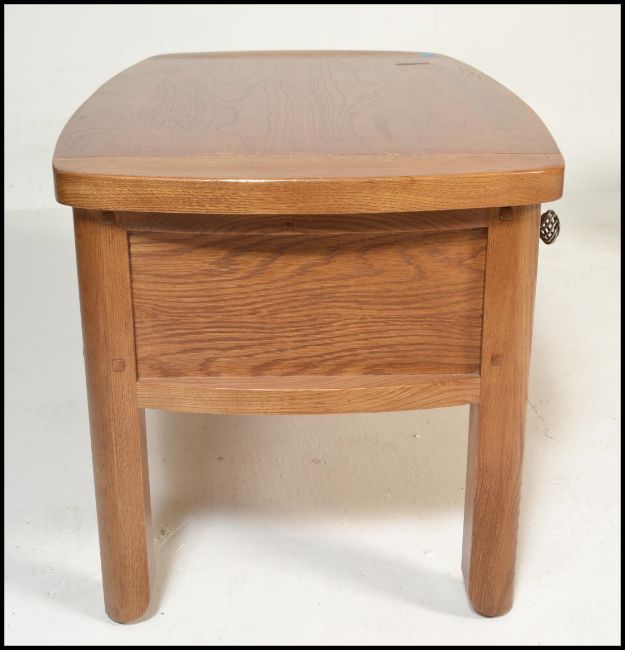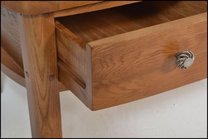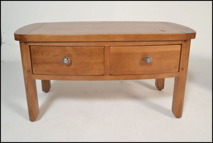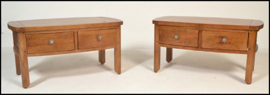 A pair of contemporary oak coffee tables of rectangular form with curved end table tops having twin drawers beneath raised on block legs. Measures: 45cm high x 90cm wide x 50cm depth